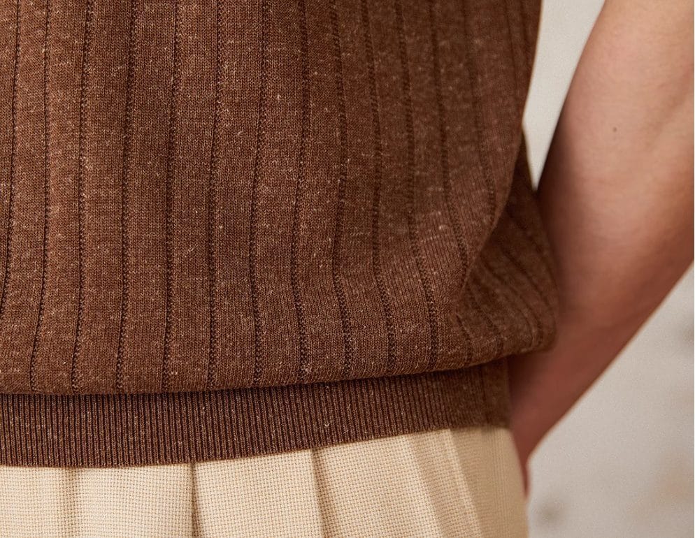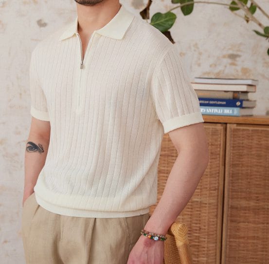 Linen Blend Lapel Zipper Sunken Stripe Short Sleeve